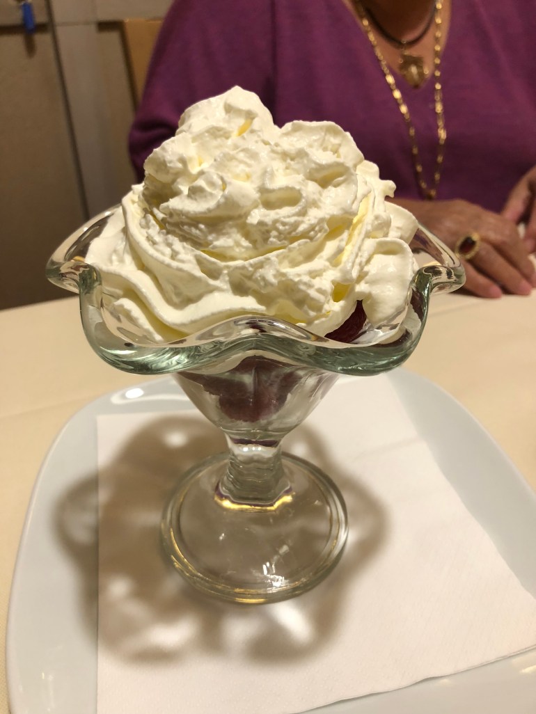 Let’s talk about capers for a minute. I don’t know how you feel about them, but I’m full on Team Caper. I will put them on everything. However, it had never occurred to me to eat them on pizza until I saw Pop order it and my mind was blown. Casablanca serves up a mean pizza with capers and this lovely desert soaked in liquor-just the way I like it.