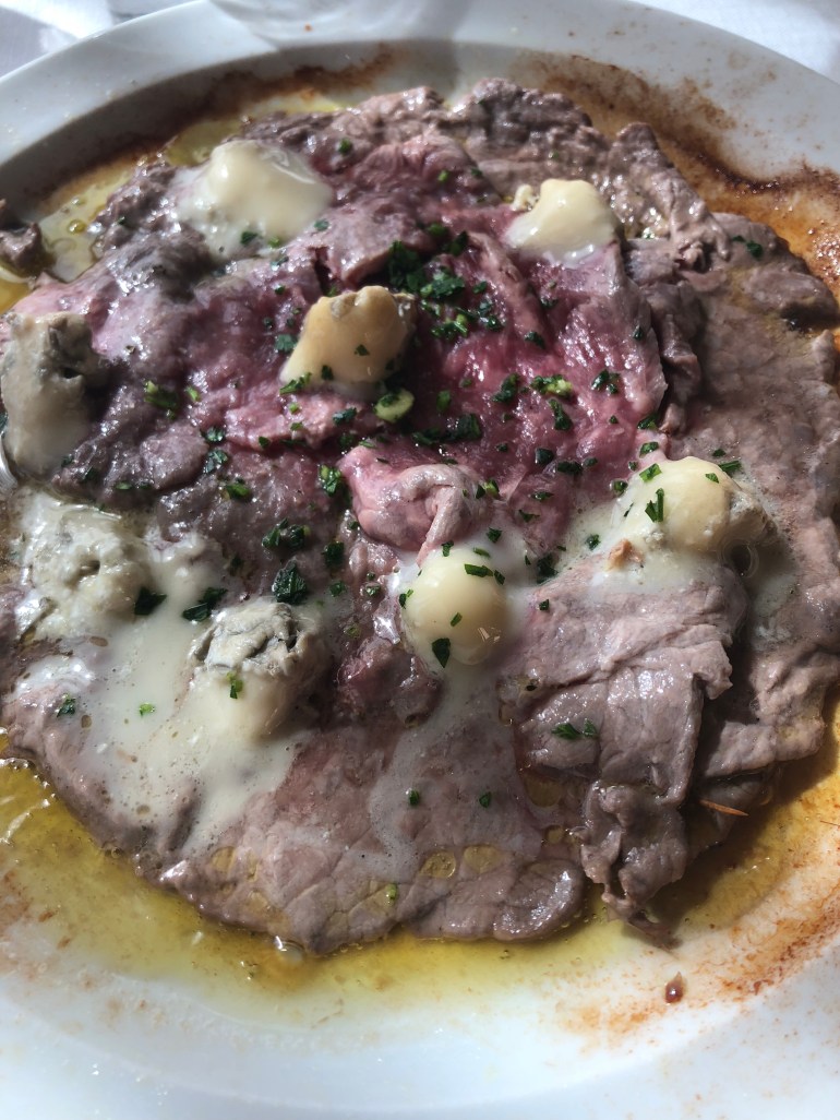 I had this dish that was very thinly sliced beef cooked on plate with oil, garlic and rosemary and topped with fresh Gorgonzola which is slid into a wood burning oven served still cooking and then I shoved it all in my face. You could have just put me at the top of the hill and I could have rolled home I ate so much. It was perfect.
