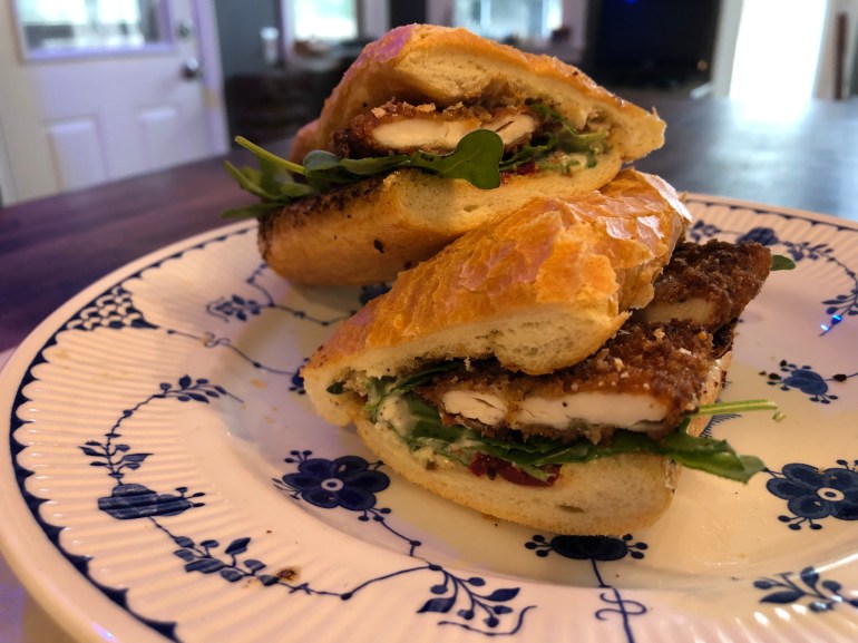 I’ve said it before and. I’ll say it again, my fav meal is a chicken Milanese salad. It’s just so damn good. The hubs, a purest when it comes to cotolette, prefers to eat his sans salad. And he really thinks it’s blasphemy what I did today with his fav Sunday lunch. I was in the mood for a sandwich, so I took some inspiration from what I consider to be the best sandwich in town (The Southern General’s Chicken Schnitzel) and made myself a damn fine sandwich. I married my love of the Milanese salad and the damn fine sandwich and what happened was sandwich magic. Enjoy. Ciao y’all.